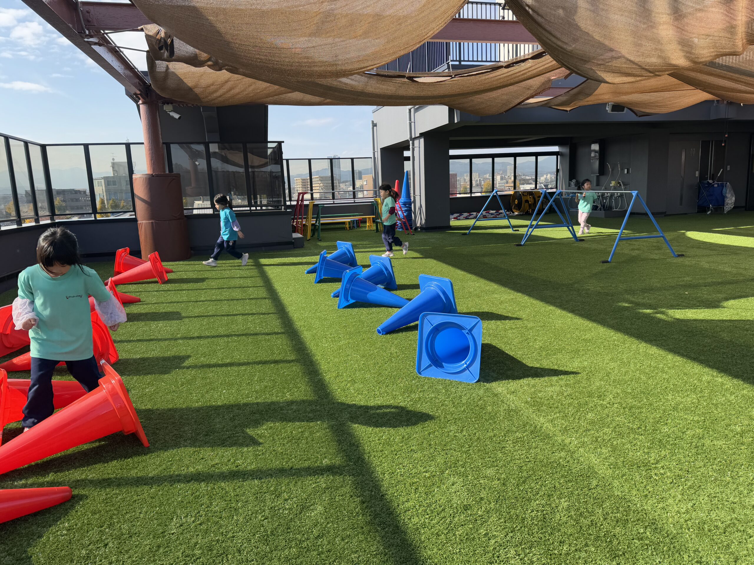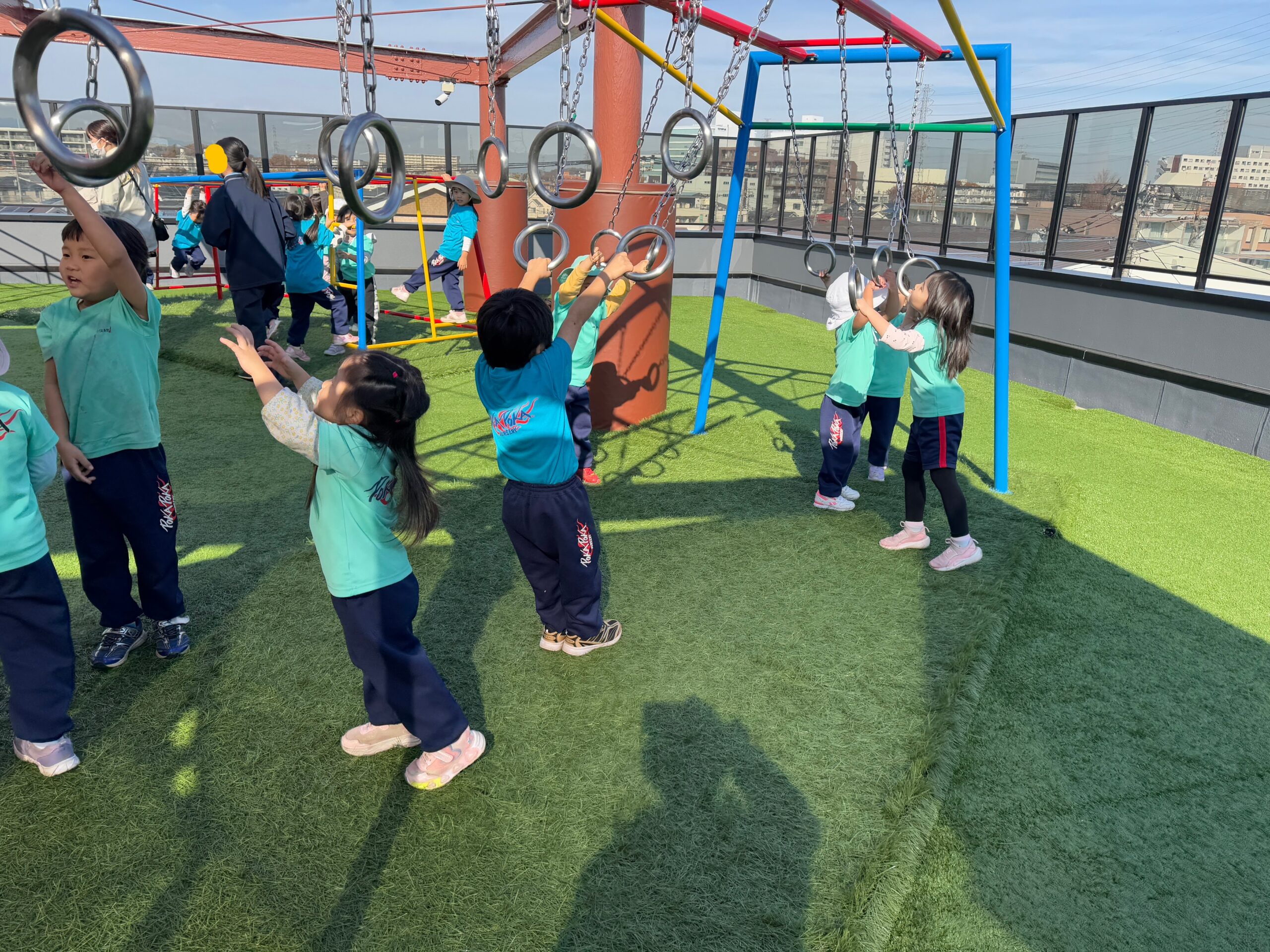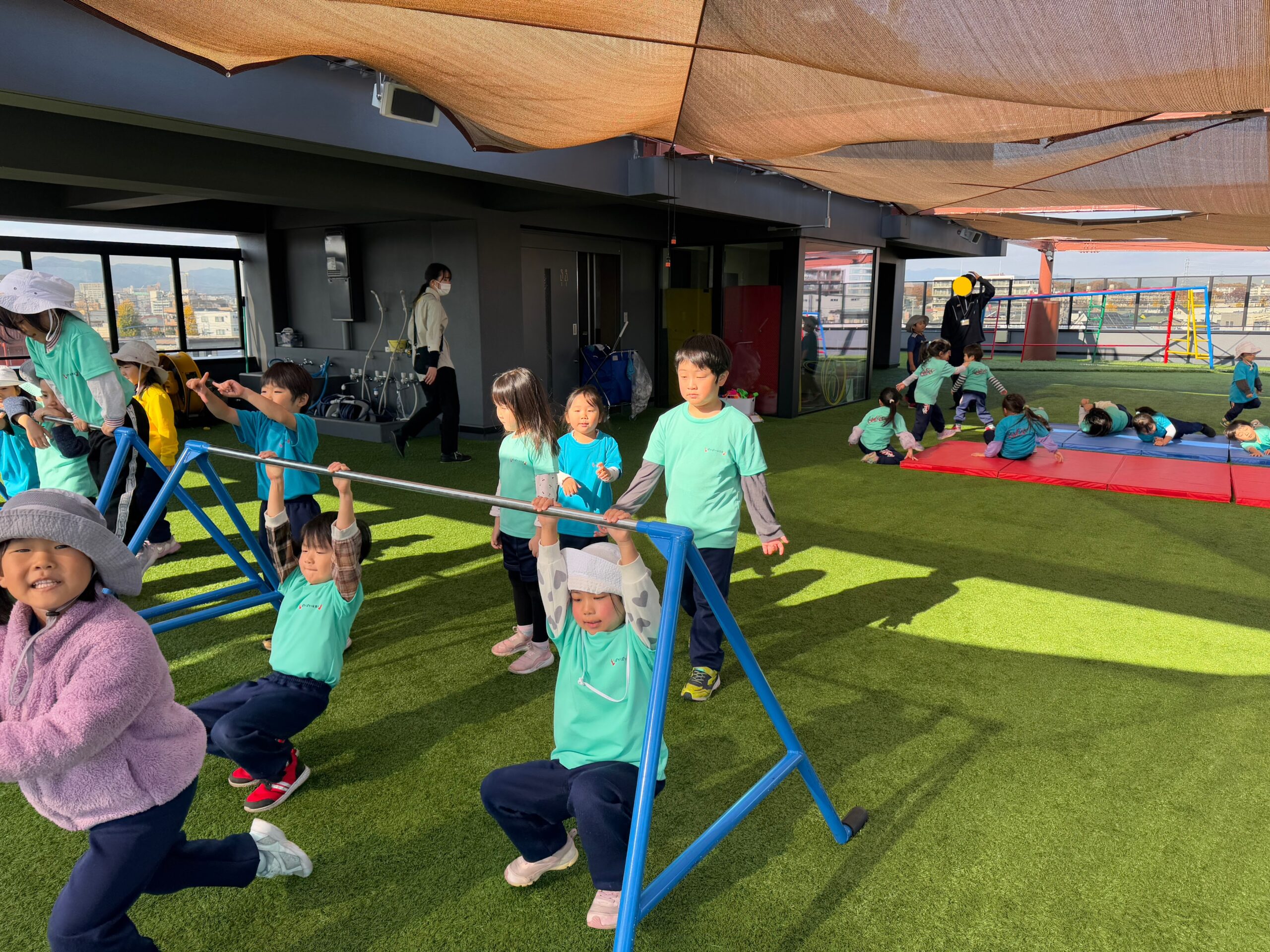 太陽の光が気持ちよくて、空を見上げながら深呼吸。「今日はいっぱい動くぞー!」と声があがり、心も身体もスイッチオン。