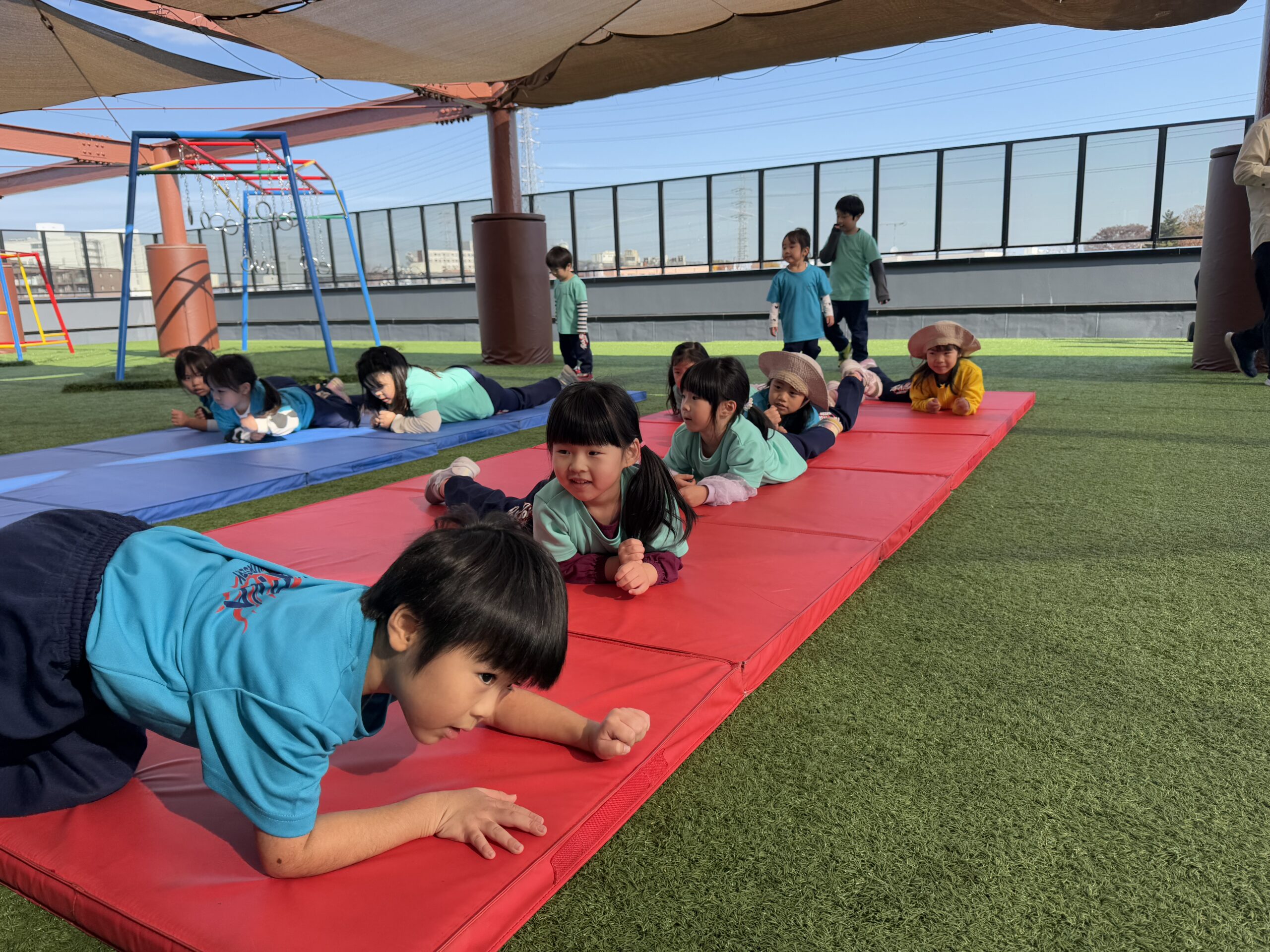 平均台をそーっと歩いたり、マットの上をくまさんやワニさんになって動物歩きをしたり、コーンジャンプで「せーの!」と跳んだり、全身を使って楽しみました。