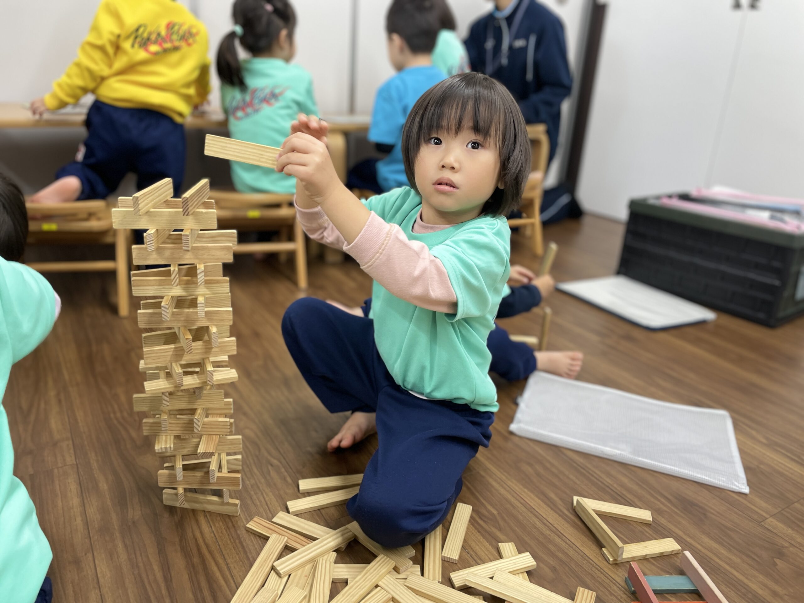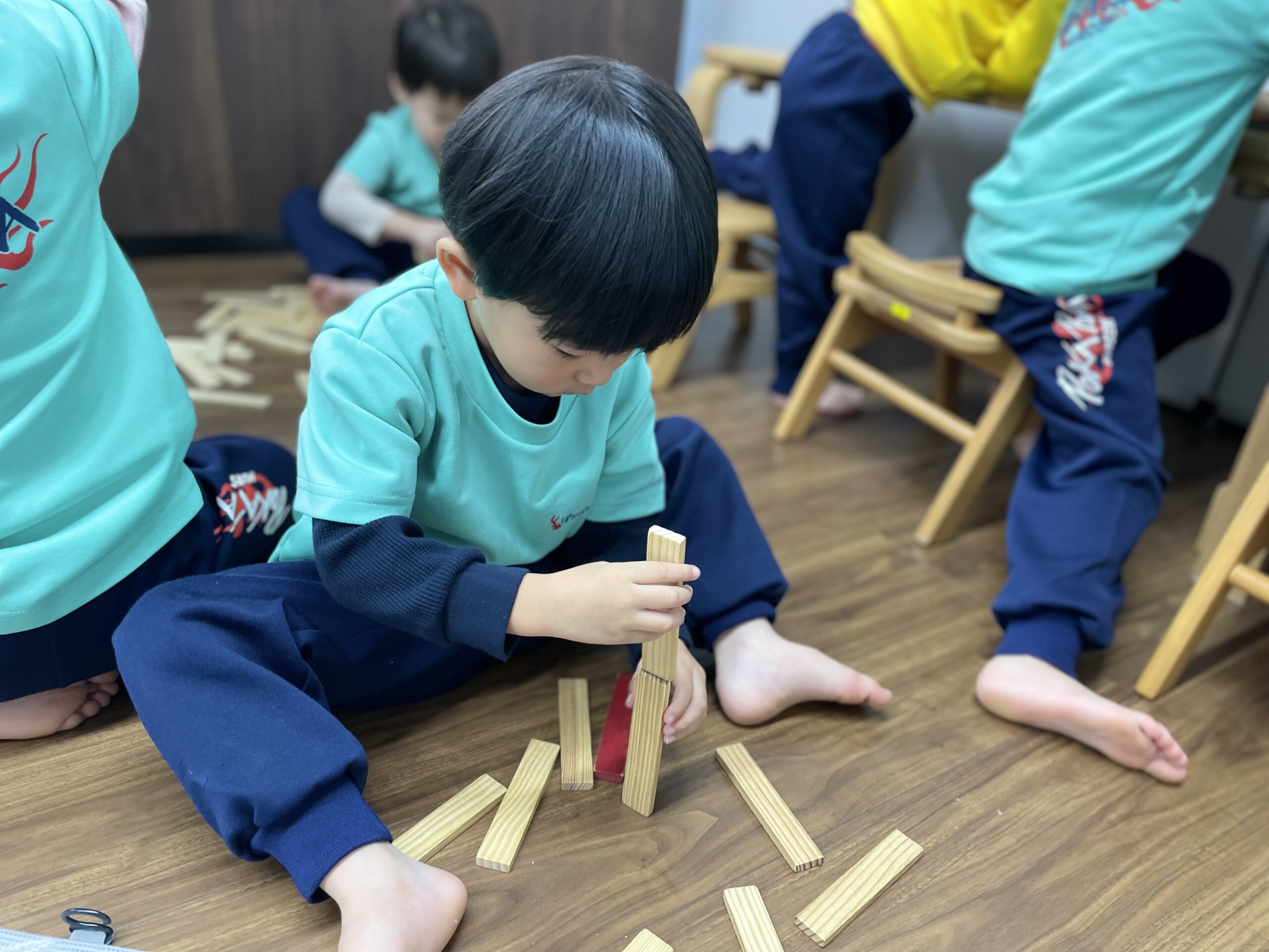 「高くできた!」「僕の方が高いよ!」とどっちが高く積み上げられるか勝負!ワークをしている4、5歳児さんの迷惑にならないように声量に気を付けながら遊ぶことが出来ていた、かっこいい3歳さんでした☆