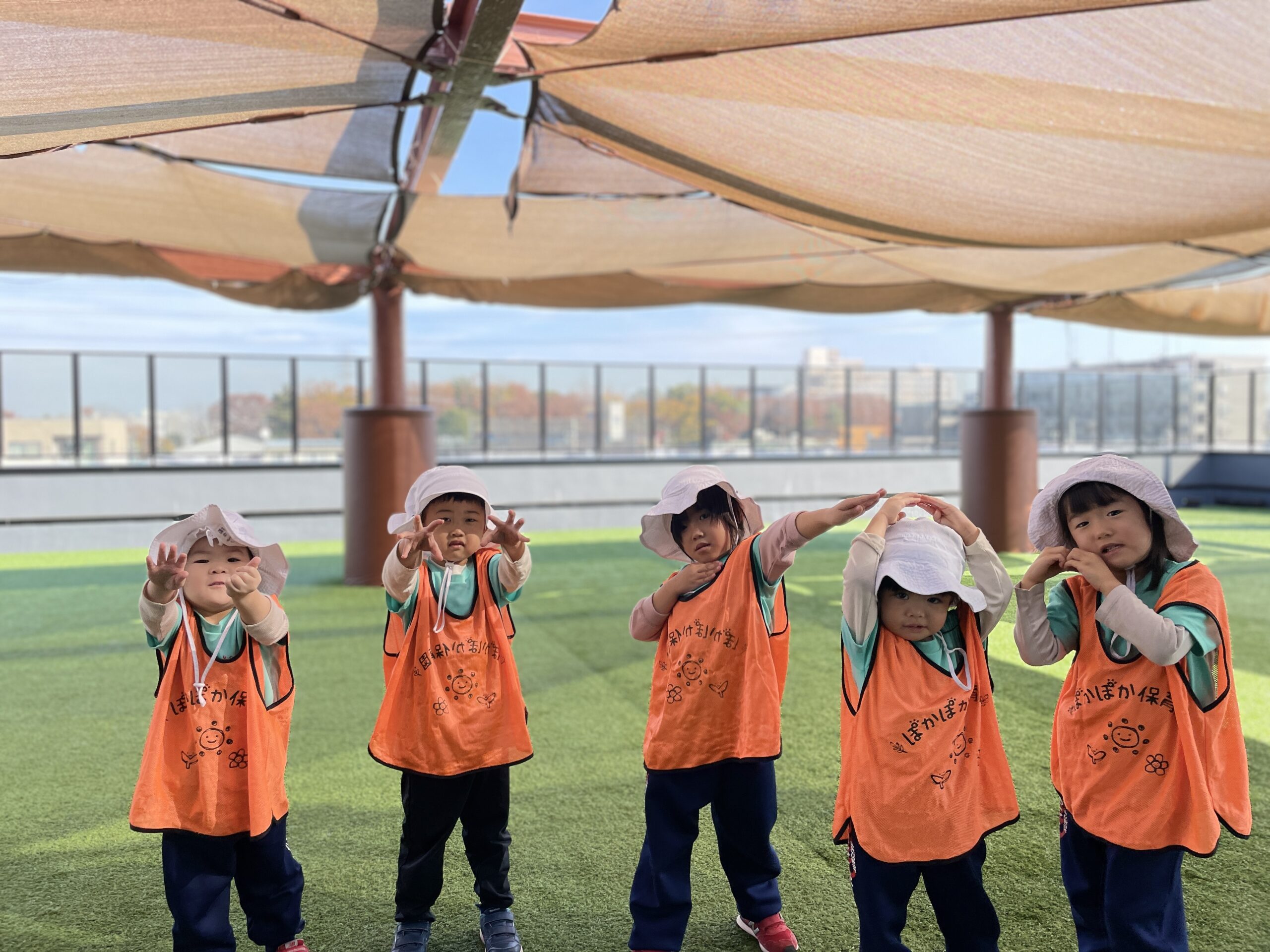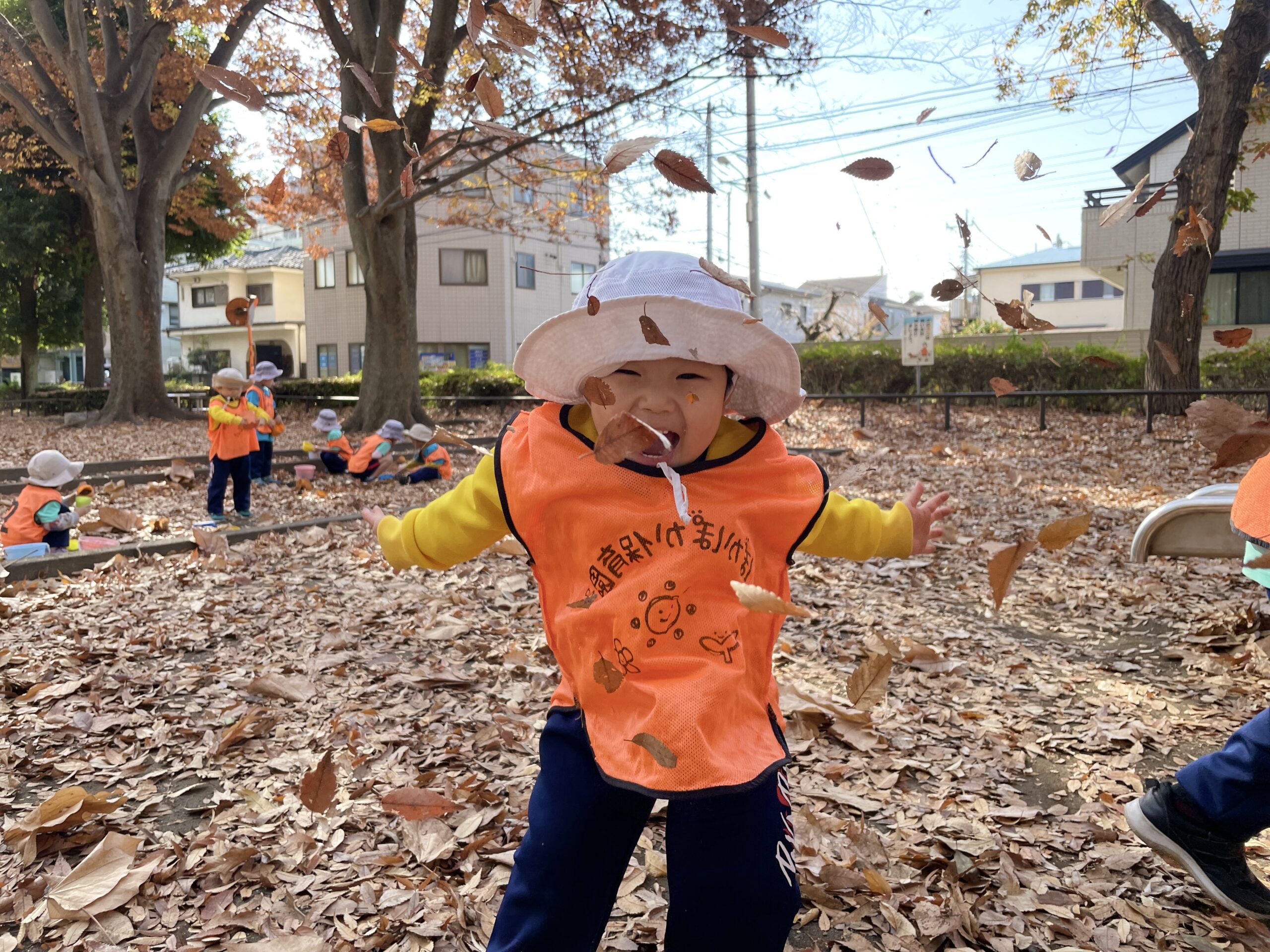 公園では落ち葉がたくさん!「落ち葉のシャワーだ!」と落ち葉の掛け合いを楽しんだり、追いかけっこや遊具を楽しみました♫