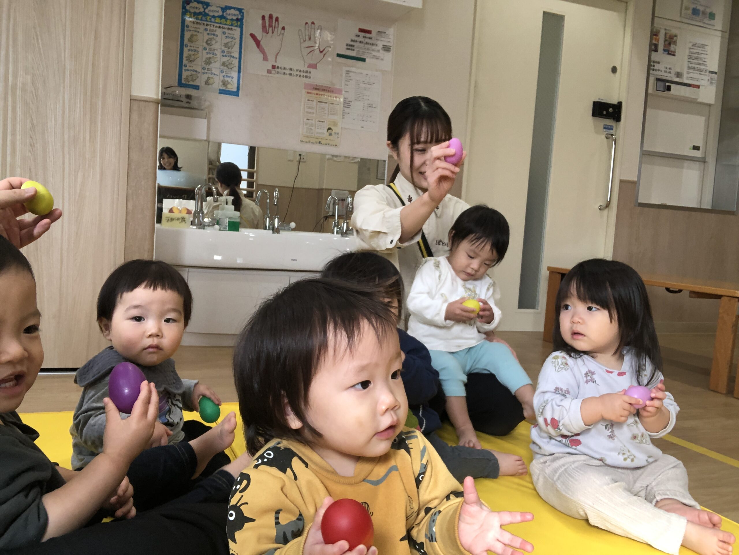 青空組さんでは、エッグシェーカーを《どんぐり・焼きいも・きのこ》に見立てて、秋の歌に合わせてリズムを奏でていきました♪