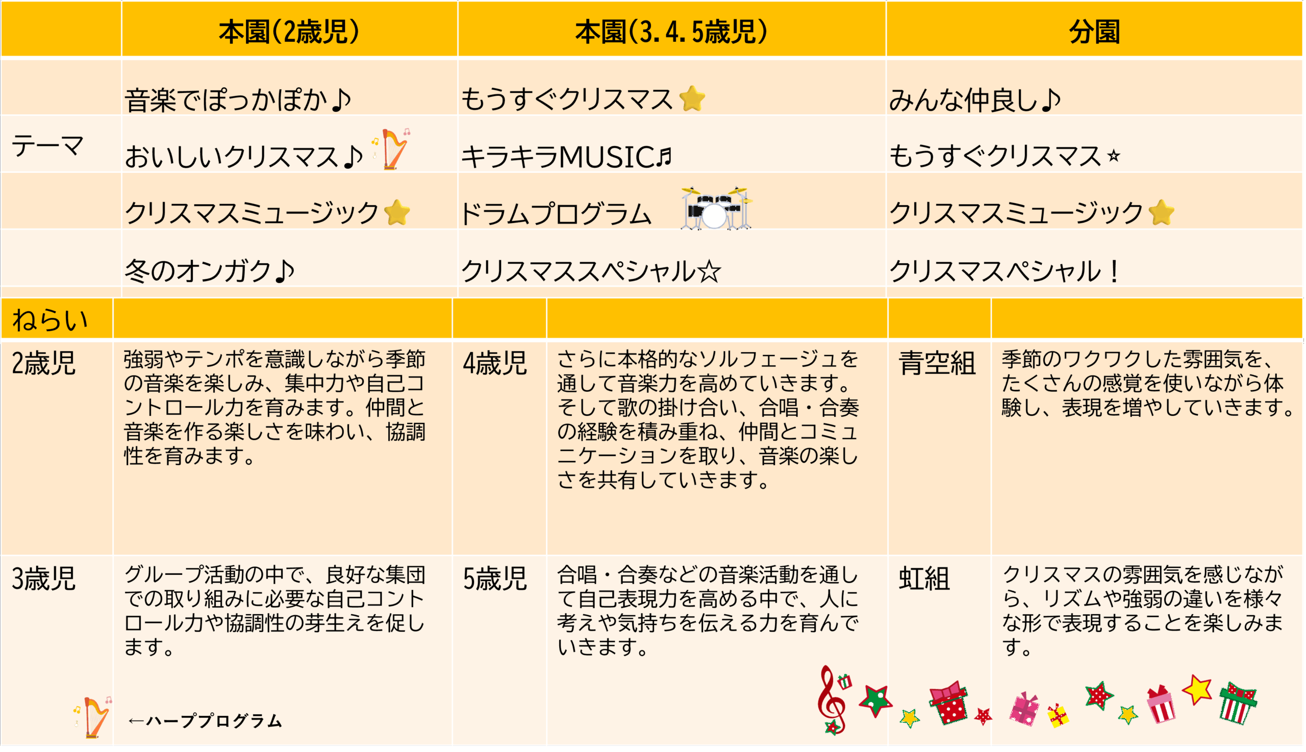 冷たく澄んだ空気に、冬の訪れを感じますね。子ども達は秋から冬への移り変わりを楽しみながら、音楽でも季節感を味わったり、それぞれの発達に合った発展的なプログラムを意欲的に楽しんでいます。