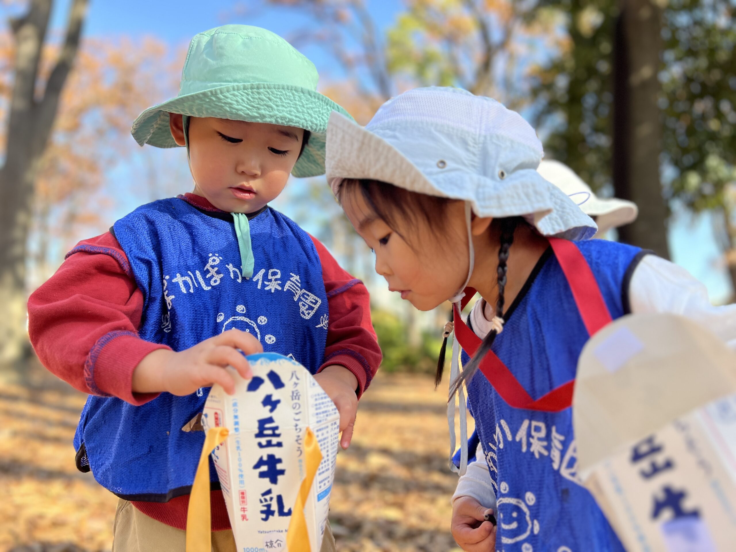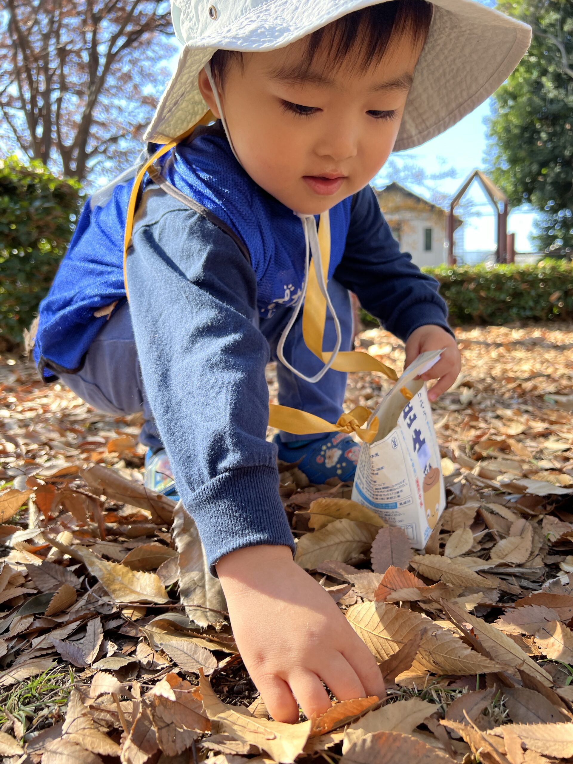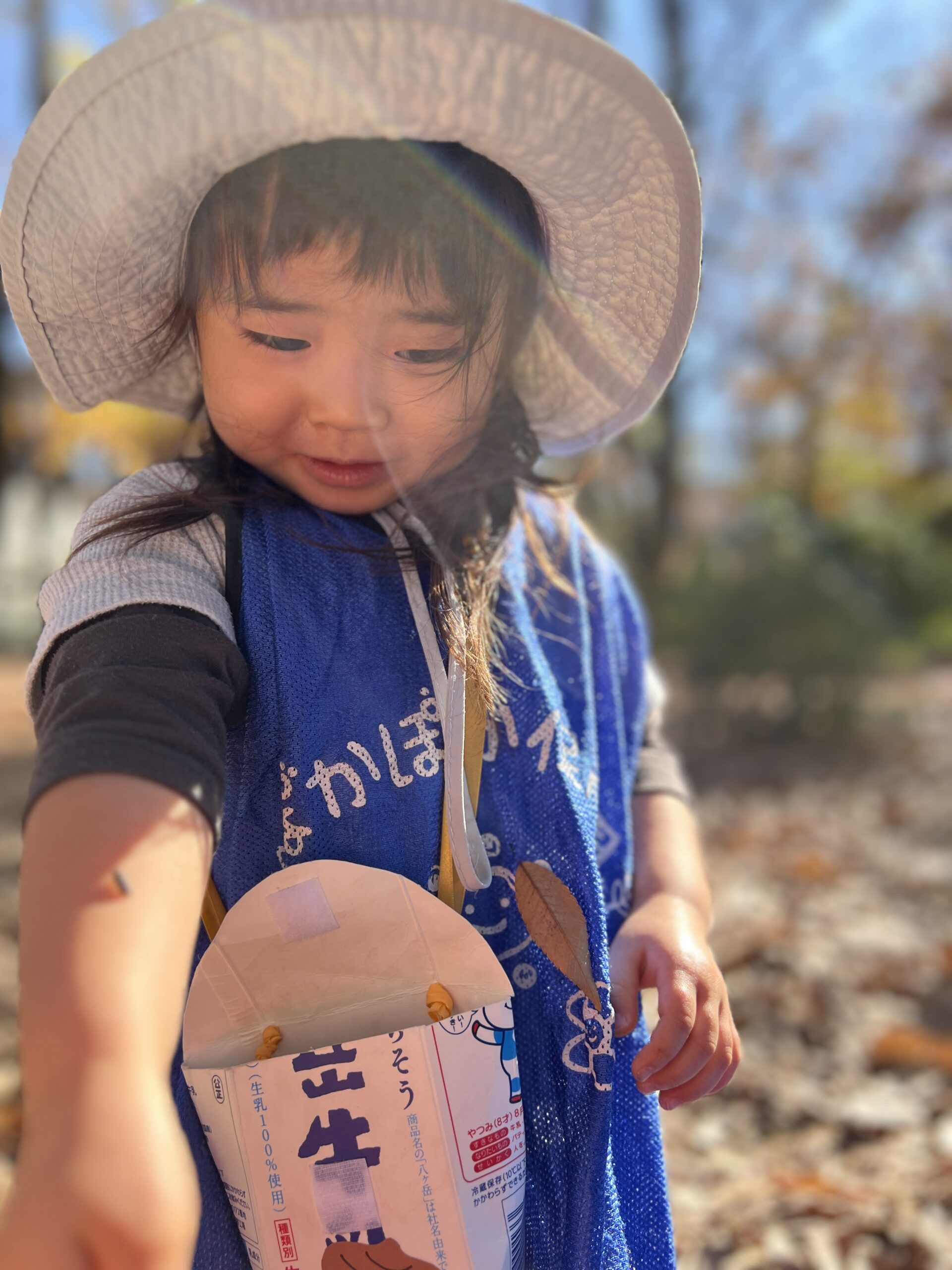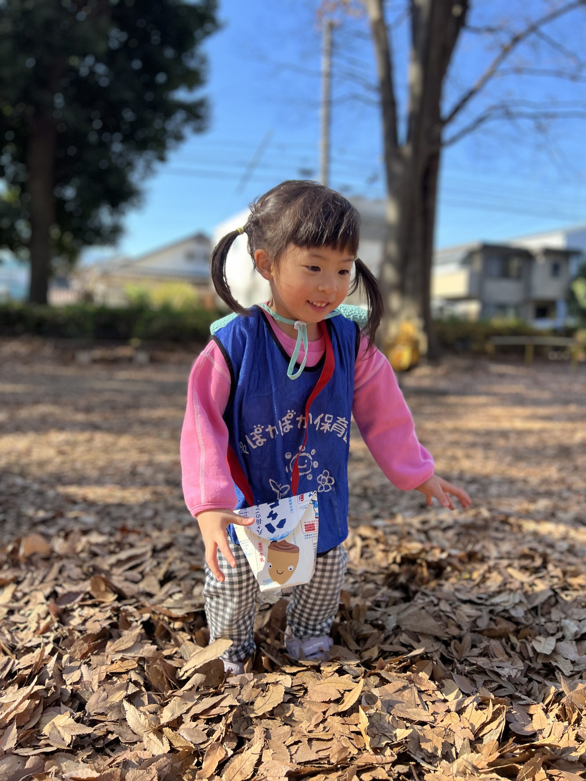 どんぐりポーチを肩から下げてどんぐり拾いに出かけました♬