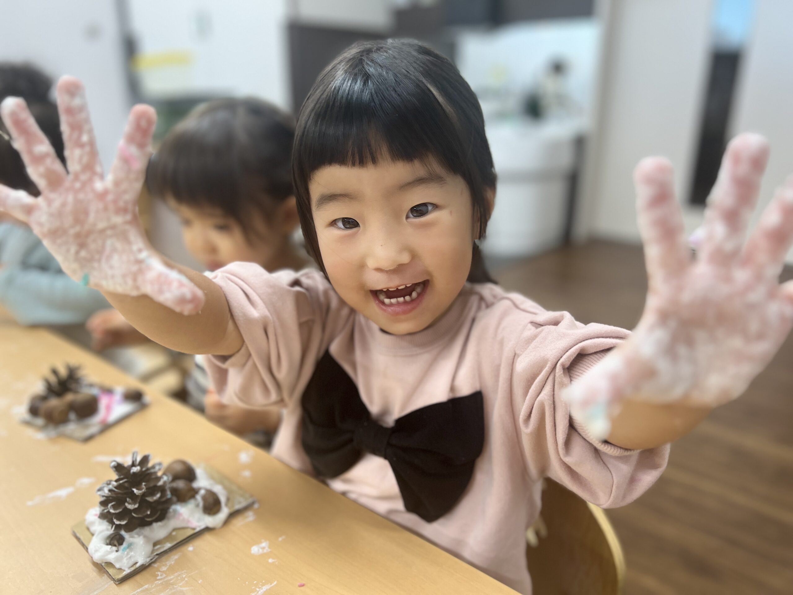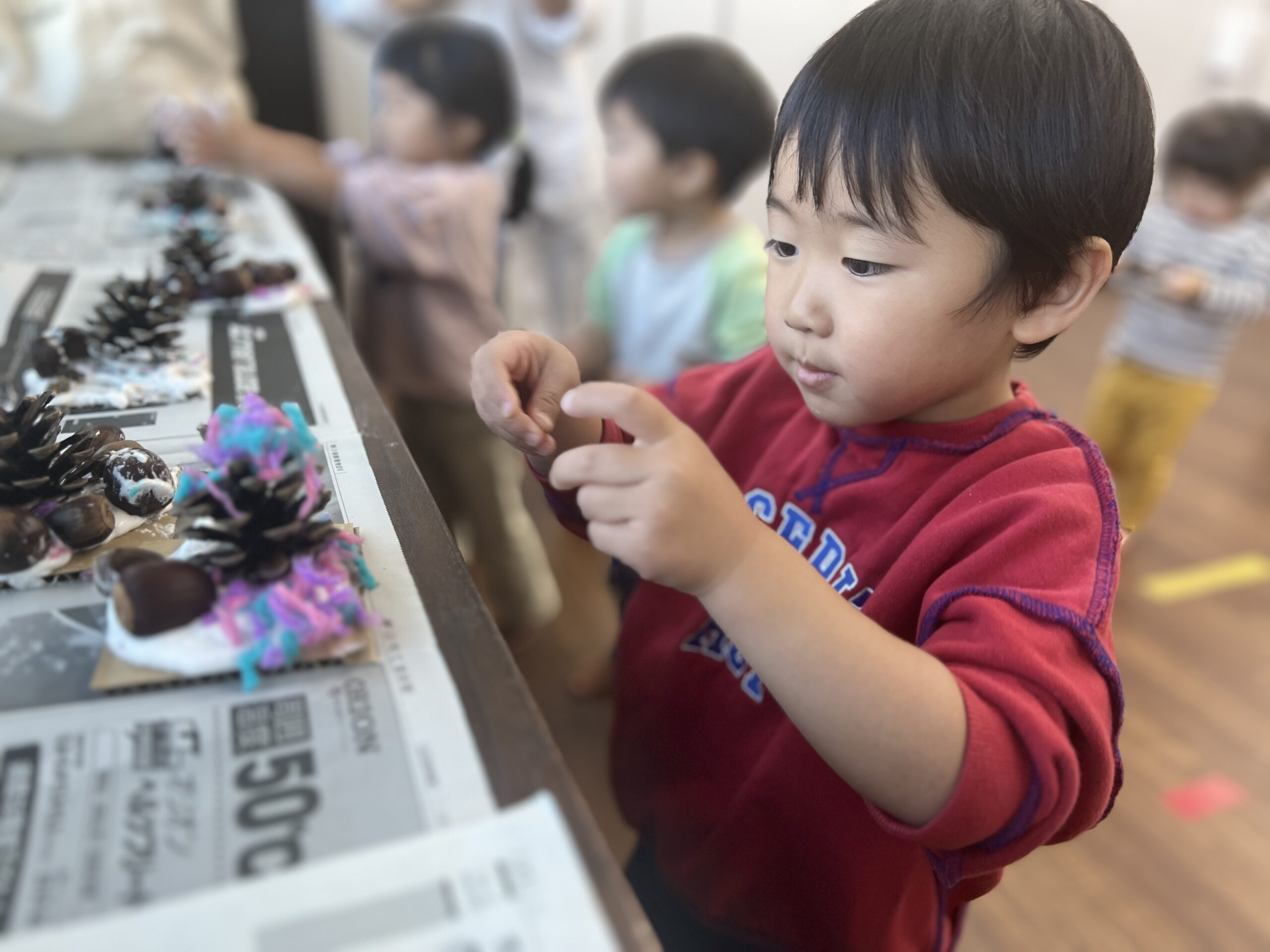 松ぼっくりやどんぐりや毛糸をのせて~~!完成!