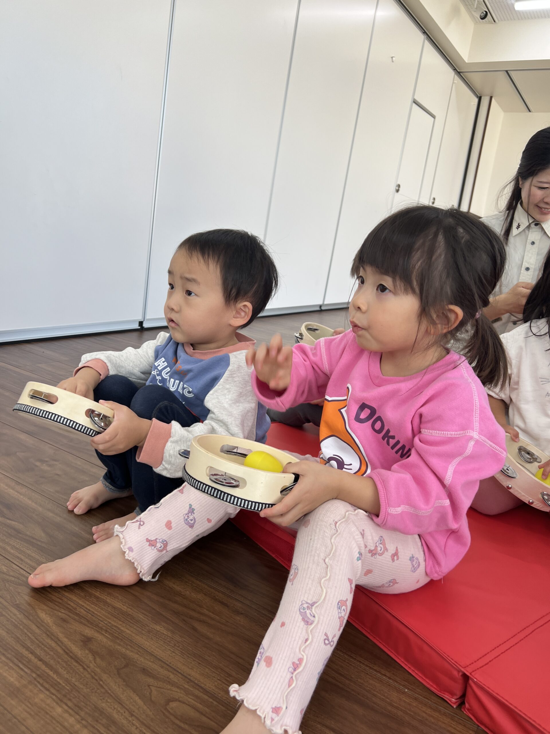 タンバリンをボウル、マラカスをたまごにして音と一緒にケーキ作りを楽しみました♡