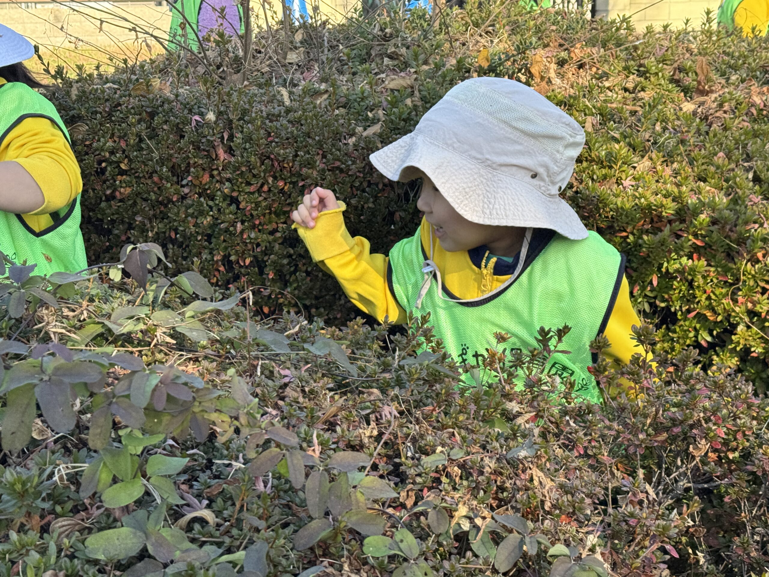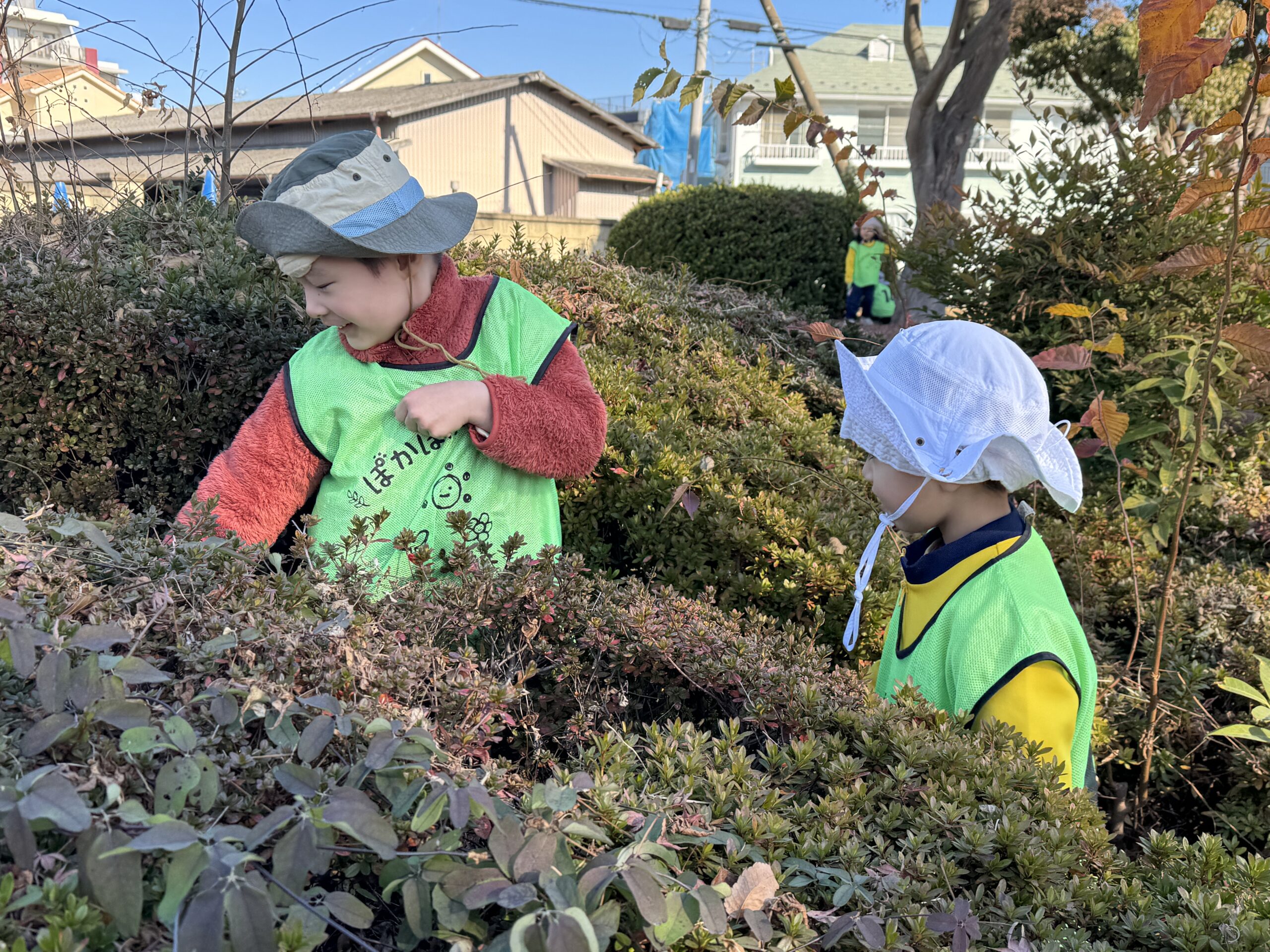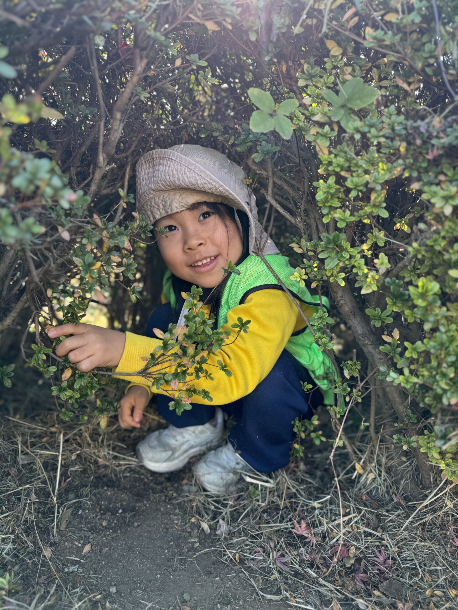 今日の自然活動では秘密基地を見つけたり、葉っぱでお店屋さんをしたり、かくれんぼをしたりと元気いっぱいに遊んだ子ども達。
