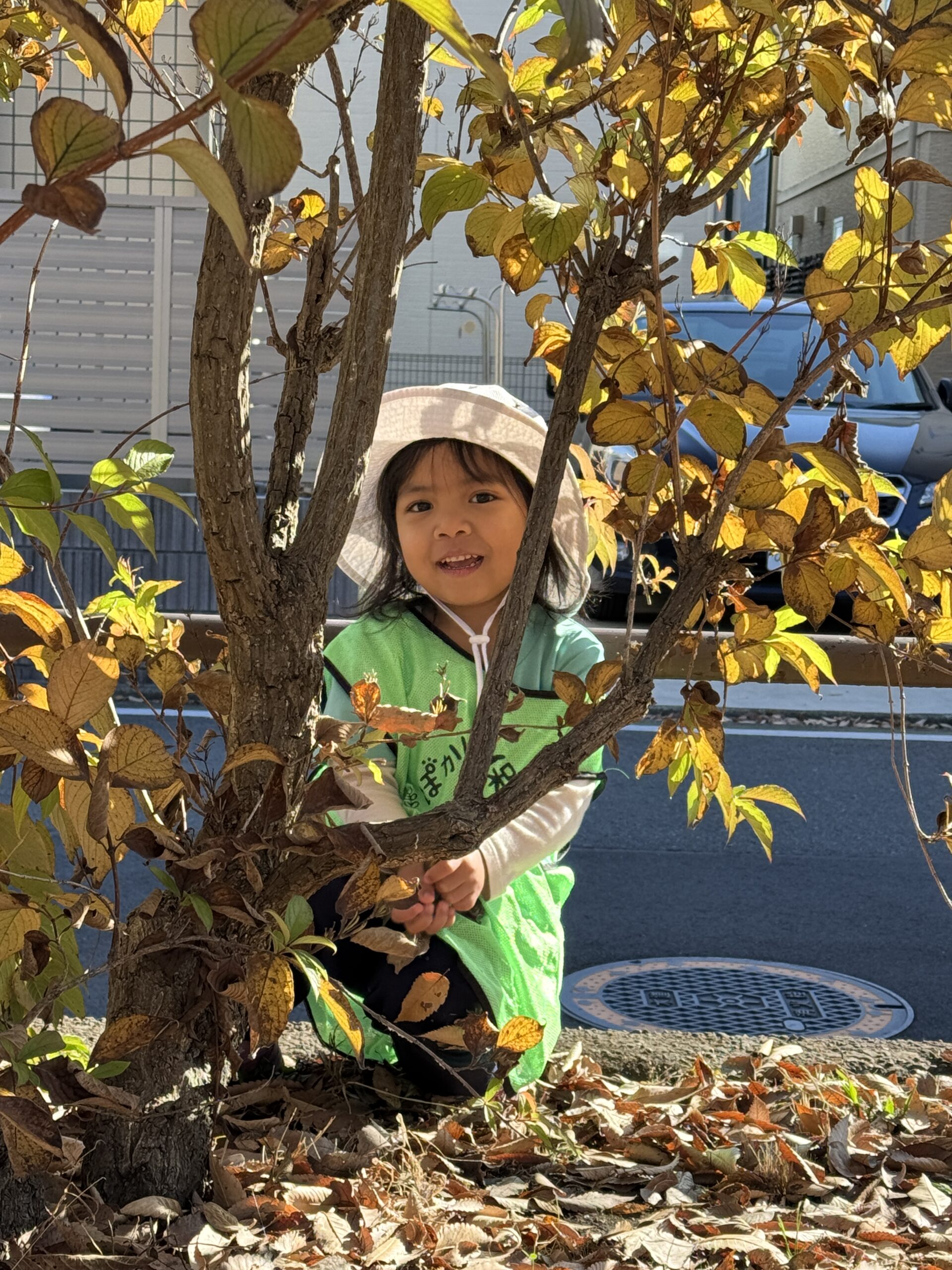 木の陰に隠れているお友だち。「何してるの?」「かくれんぼだよ!」隠れる場所が多いと遊びもはかどりますね。