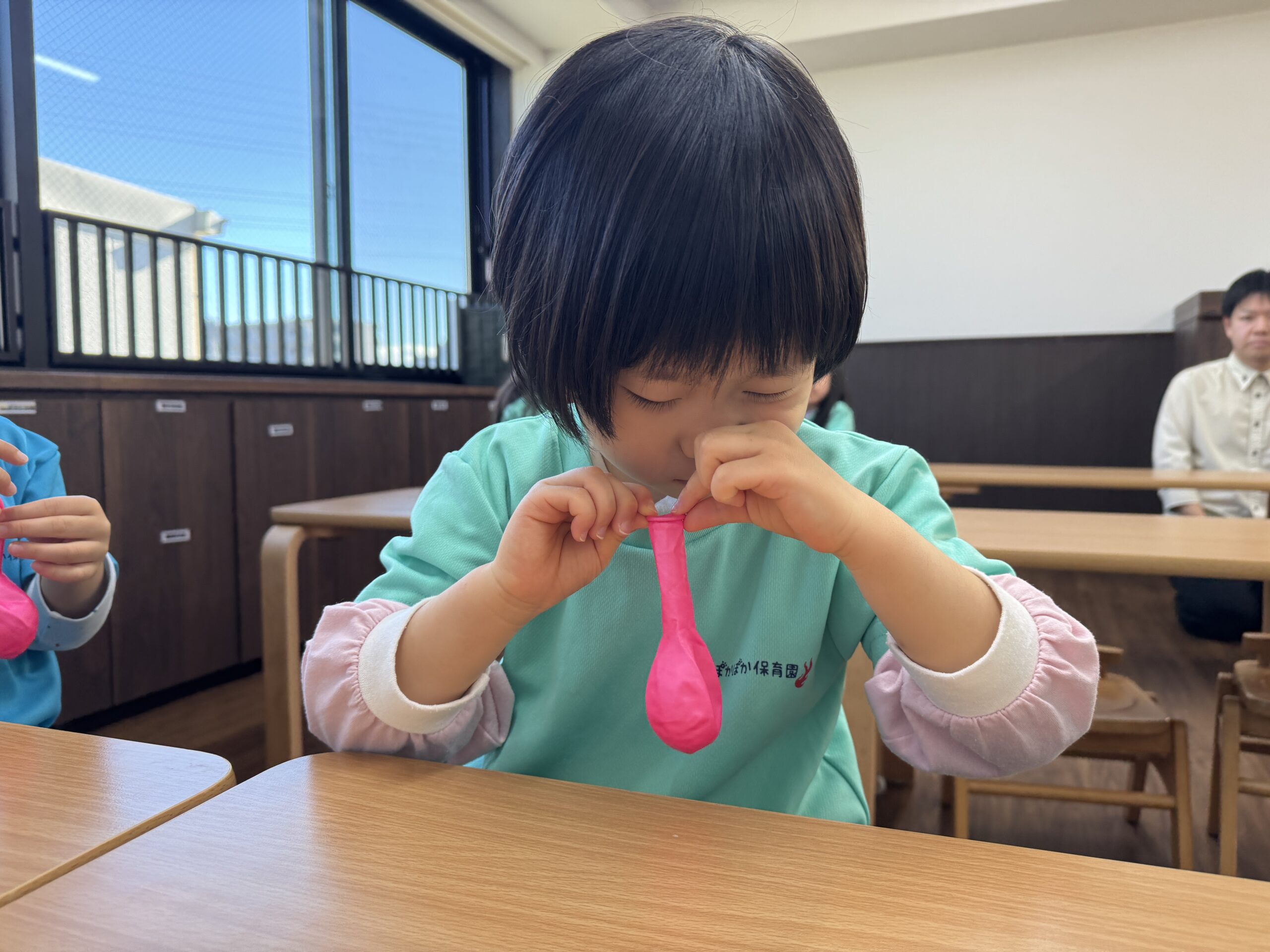 子ども達のなかには、風船がうまく膨らまなかった子たちもいましたが、