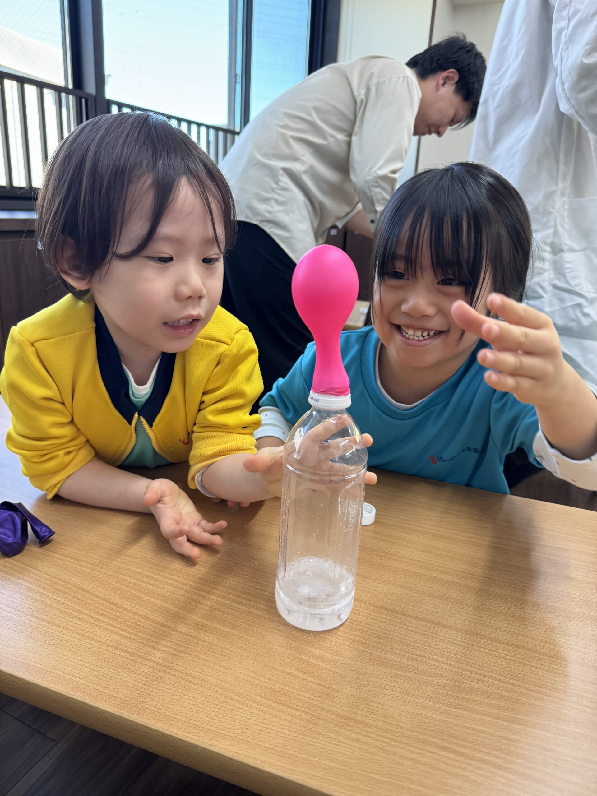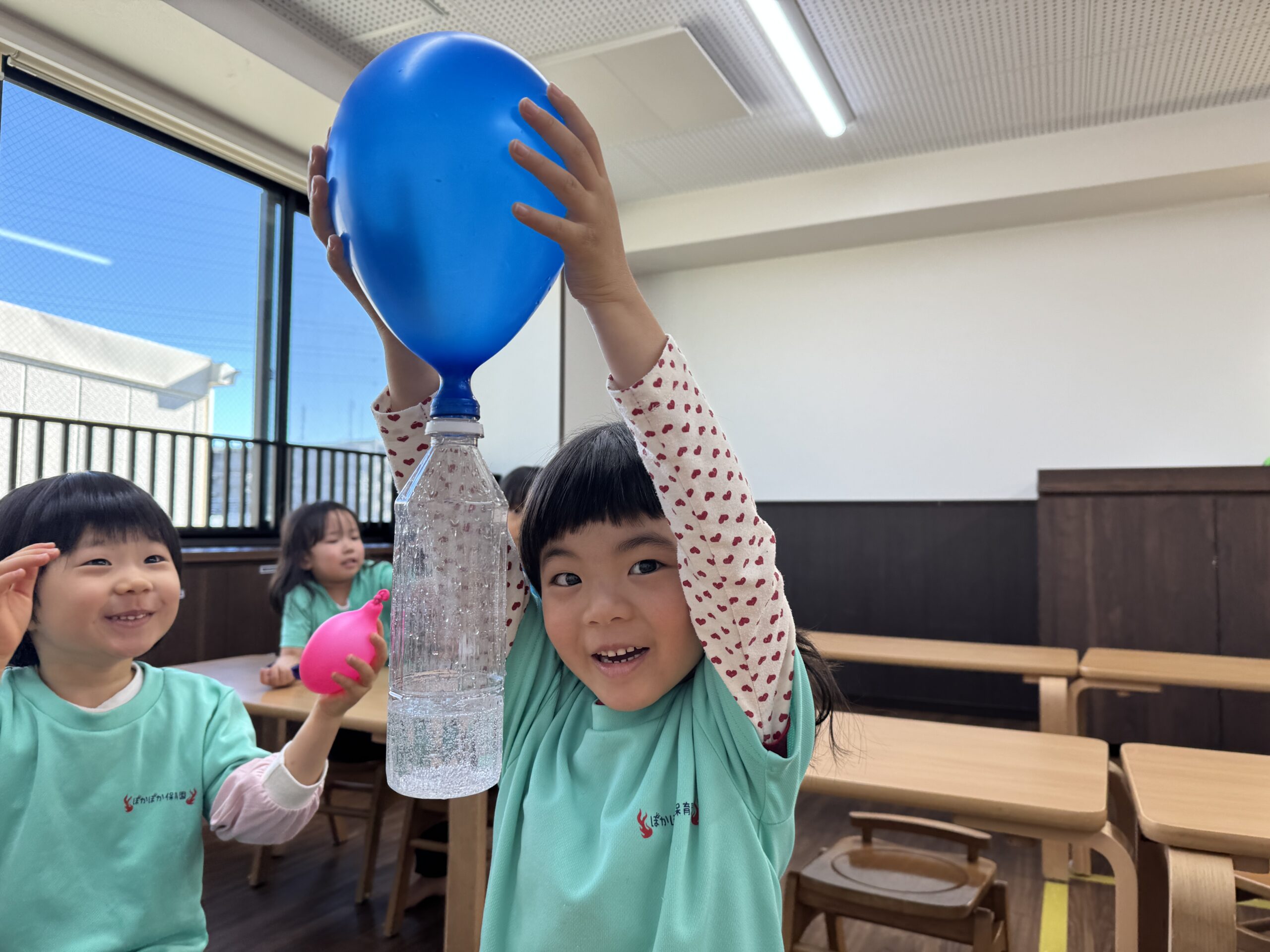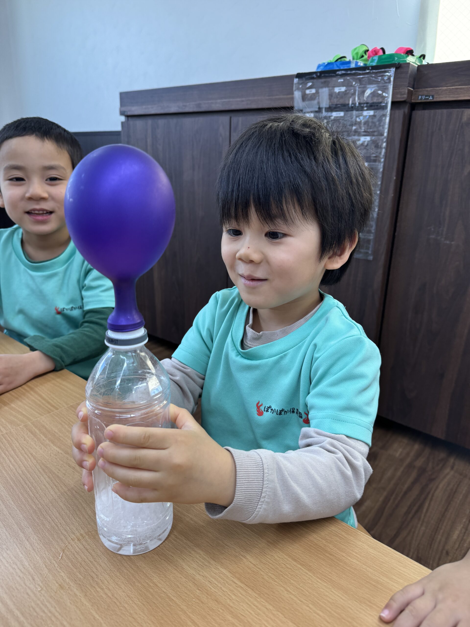 口で空気を入れて膨らます方法しか知らない子ども達は、勝手に膨らむ風船🎈にびっくりしている様子でした♡