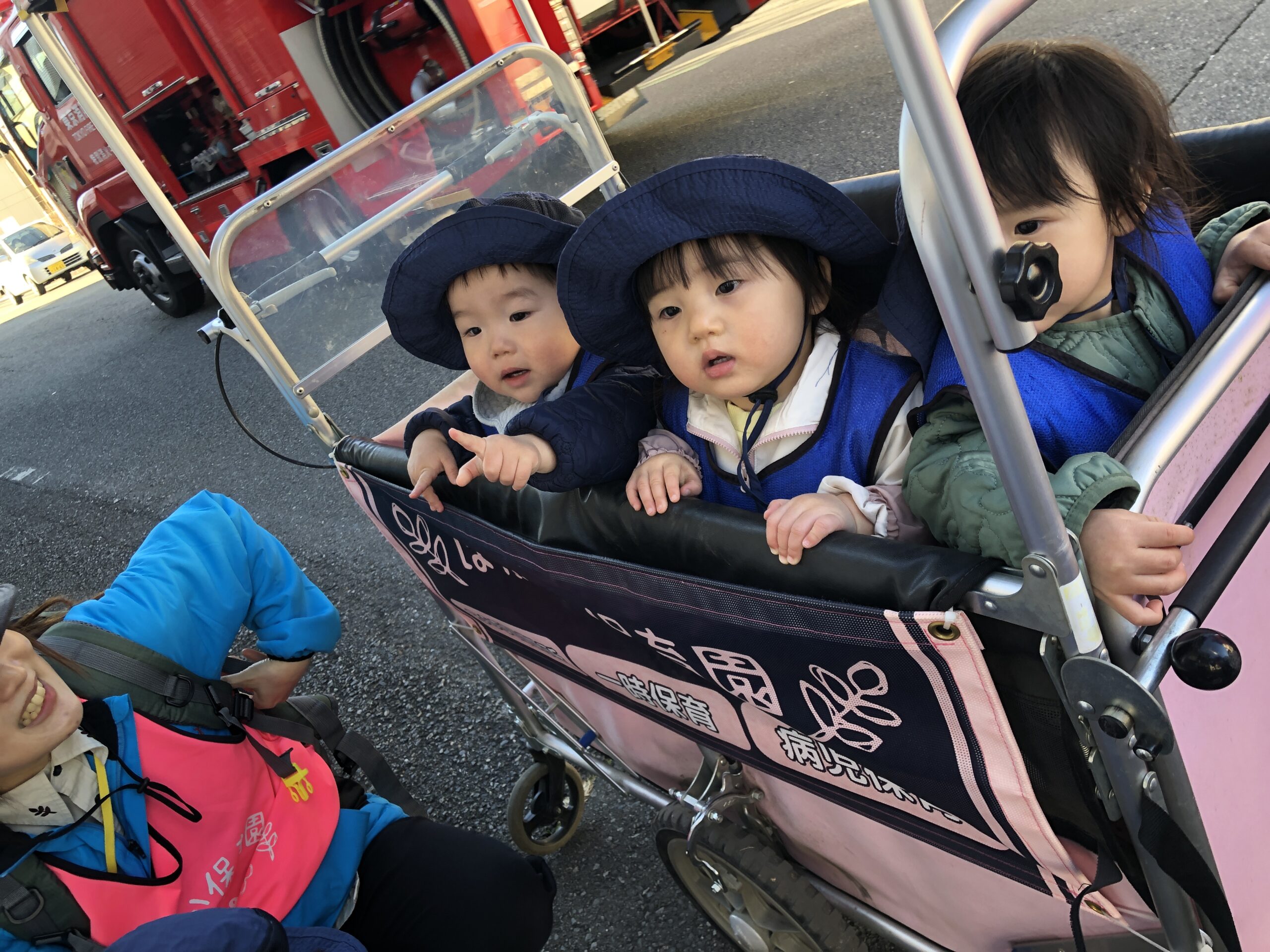 0歳児さんはバギーで、歩ける子は先生と手をつないで歩きます。途中のお店の首振り人形を指差して、